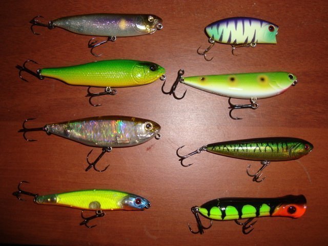 В этот класс приманок входят следующие виды: уокеры, попперы, саб-уокеры, пропбейты. Окунь ловится на все виды этого класса, но есть смысл остановиться на уокерах и попперах. Это два вида приманок, которые дополняют друг друга. Если окунь берет поверхностные приманки, то имеется возможность расширить возможности как одного, так и другого типа. Дело в том, что окуню может не понравиться, что поппер создает много шума и тут выручит уокер. Если шума недостаточно и окунь вяло реагирует на уокер, то следует запускать поппер. Самый оптимальный размер топ-вотеров на окуня лежит в пределах 65 мм.