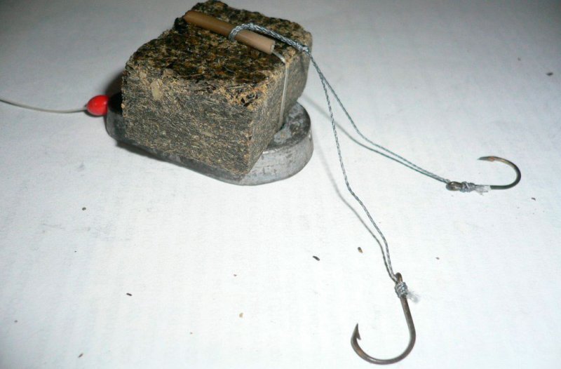 Если груз крепится вглухую, то есть, неподвижно, то он должен иметь специальную форму (плоскую или типа «ласточкин хвост»). При креплении брикета, он, как правило, плотно прилегает к грузилу. Для крепления макухи в центре кубика сверлится отверстие, через которое и осуществляется крепеж приманки. Поводки крепятся к концу основной лески с помощью карабина и вертлюжка.