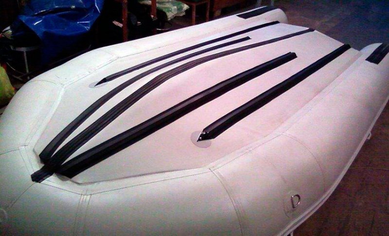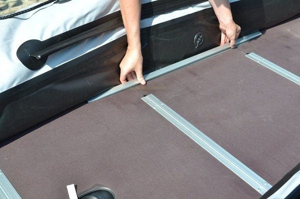 Если на лодке установлен жесткий пол, то придется установить дюралюминиевые профиля. Поскольку лодка деформируется во время движения, то жесткие пайолы пола касаются надувных частей лодки и происходит процесс трения. Это может привести к истиранию ткани, что нежелательно и способно привести к нарушению прочности лодки. В носовой части, где профиль лодки имеет криволинейную форму, стрингеры не устанавливаются.