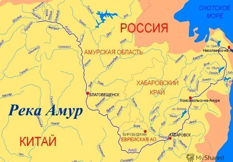 Монголы называют Амур «Амур Хара-Мурэн», что в переводе означает «черная широкая река». Река Амур протекает по территории 3-х стран, таких как:
