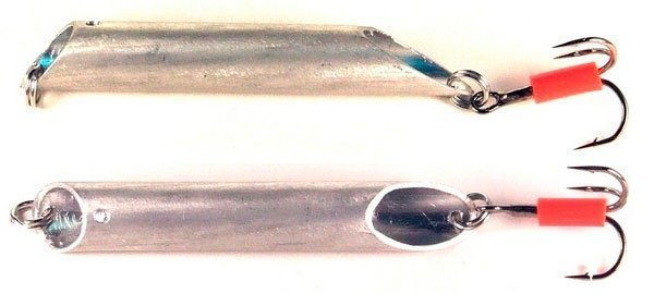 - Из металлической трубки делается трубчатая блесна. Для этого берется трубка из какого-либо металла нужного диаметра, после чего она обрезается с двух сторон под разными углами. После этого внешняя часть трубки шлифуется и полируется. В заключение, с обеих сторон сверлятся отверстия для крепления. Тройник устанавливается со стороны более острого угла, а крепеж к леске осуществляется с более тупого конца. Это придаст приманке необходимую игру.