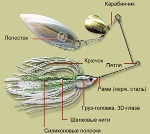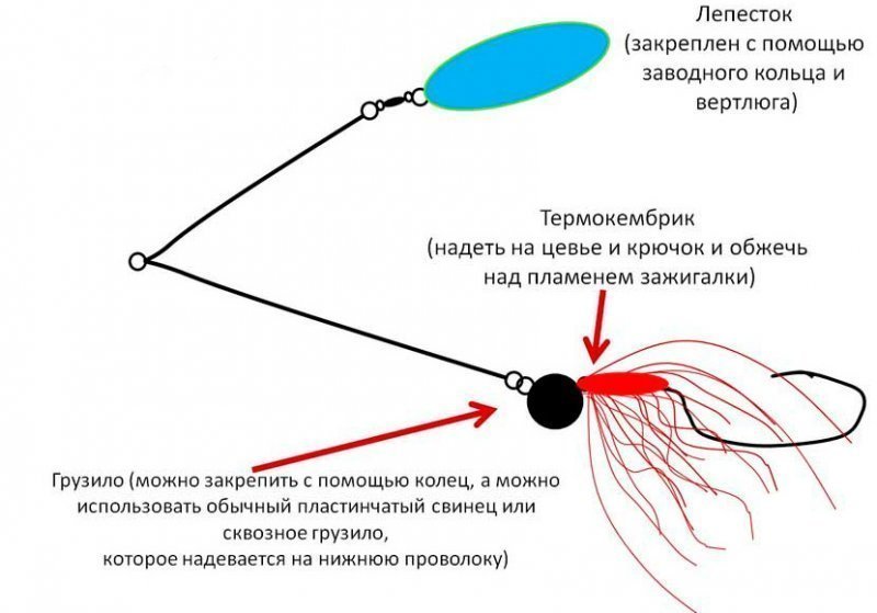 Основу этой приманки составляет Г-образное металлическое коромысло. На одном конце коромысла крепится вращающийся лепесток, а к другому концу крепится джиг-головка. Джиг–головка закрывается силиконовой «юбкой», которая выполняет две основные функции: защищает грузило и крючок от зацепов и дополнительно привлекает хищника. Поклевки бывают очень быстрыми, и рыбак должен быть всегда к ней готов.