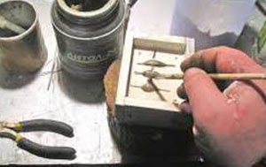 Начинают изготовление приманки с закрепления крючка на одном из плеч коромысла. В данном случае – это более длинное плечо. Чтобы закрепить проволоку на крючке, ее продевают через ушко крючка и делают скрутку. Для надежного крепления достаточно сделать пару оборотов. При этом лишнюю проволоку нужно откусить кусачками. В дальнейшем эта скрутка будет залита свинцом, что сделает соединение более надежным. Для этого соединение вставляется в форму для отливки груза и заливается свинцом. Нижняя часть практически готова.