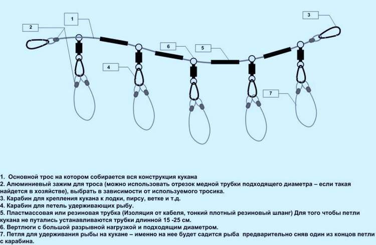 Обычно длина кукана составляет 1,5-2 метра, но для его изготовления необходимо иметь около 5-ти метров тросика. Толщина троса в 2-3мм абсолютно достаточна и не имеет смысла брать за основу трос большого диаметра: такой трос выдержит и крокодила.