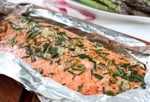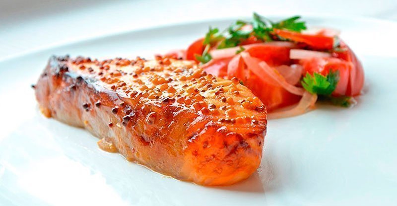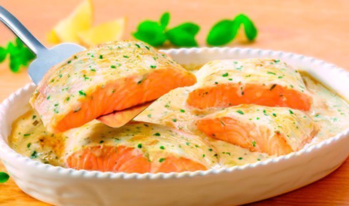 - Приготовленный по этой технологии лосось подается с соусом (например, тартар) и с гарниром любого происхождения (картофель, каши и т.д.).