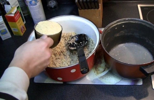 Ставится на огонь 5-ти литровая кастрюля и наливается в нее вода. Ее объем должен быть в три раза больше, чем объем всех ингредиентов. Исходя из рецепта – это 4,5 кружки воды и ждем, пока она закипит, после чего в воду засыпается 0,5 кружки перловки. Варится перловка на маленьком огне до готовности. Это можно определить по тому, как замутнеет вода, а перловка по краям станет прозрачной.