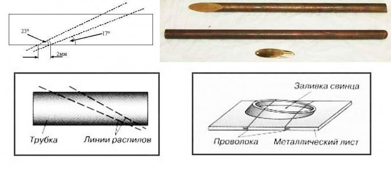 Для этого берется металлическая труба, диаметром около 15 мм и от нее отрезается заготовка, по форме близкая к форме блесны. После этого, труба разрезается вдоль, после чего заготовка, отрезанной частью крепится к металлической пластине. Важно, чтобы пластина плотно прилегала к половинке трубы. Остается только залить ее свинцом или припоем. После заливки и ее остывания, в приманке делаются соответствующие отверстия, а сама блесна тщательно обрабатывается и полируется. В заключение, ее покрывают водостойкой краской.