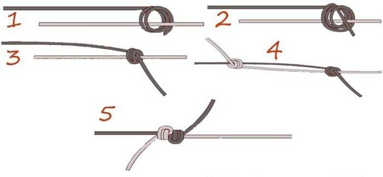 Одна нить обкручивается вокруг другой несколько раз, но не туго, чтобы через них можно было пропустить конец. Такие же действия проводятся и с другой ниткой. Потом узел затягивается одним действием за два конца. Данный метод является наиболее прочным в рыбалке.