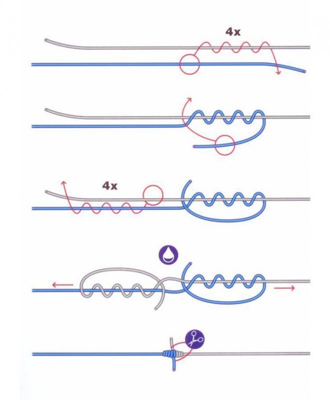 Скользящий двойной узел является прочным и надежным. Разница в диаметре между скрепляемыми лесками должна быть не более чем в 1,5 раза. Его можно применять для монофильных лесок, для плетенных лесок, а также для прикрепления к леске фторкарбонового поводка. Рассмотрим пошаговую инструкцию как привязать леску к леске.