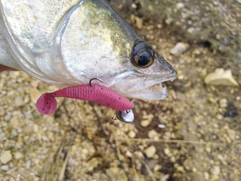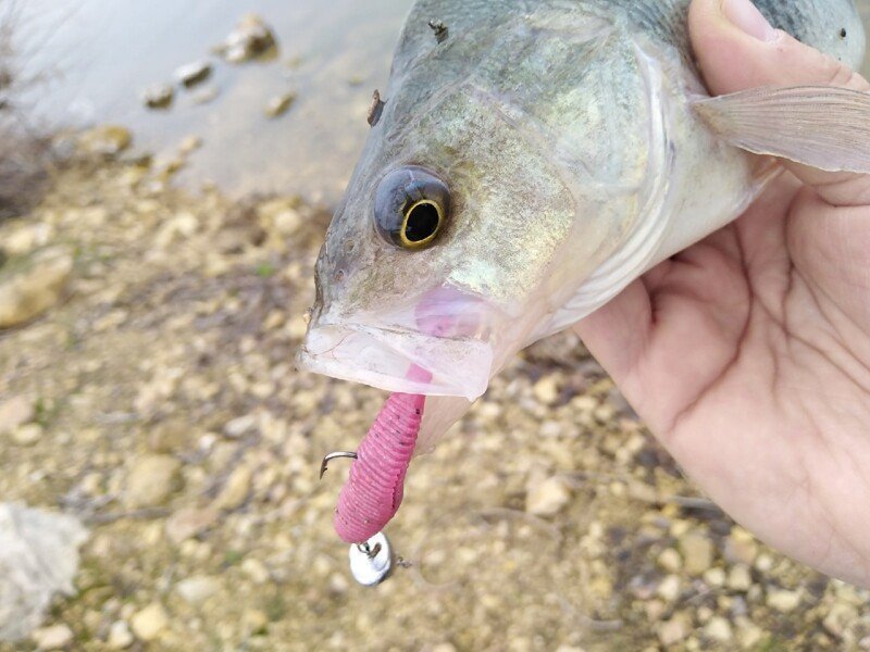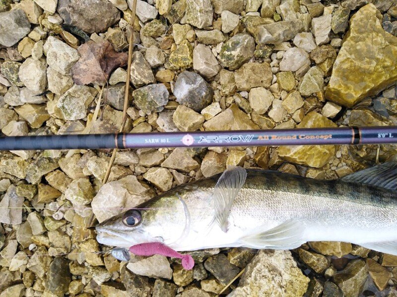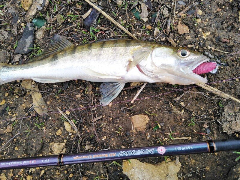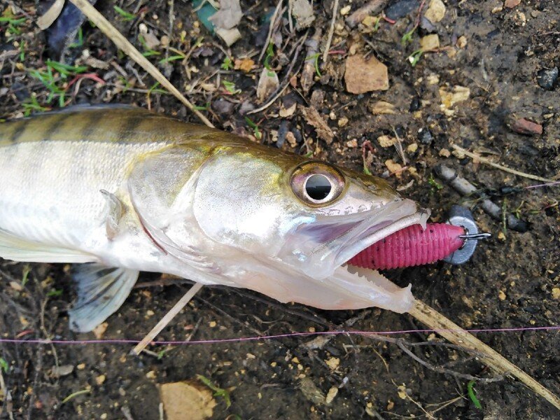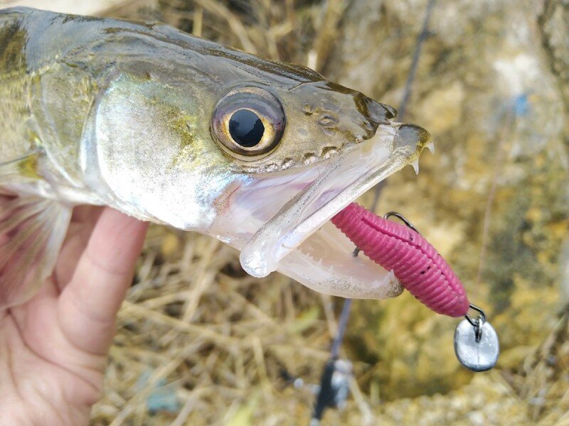 Знание местности и всех подводных «баррикад», как понимаете, выходит на первый план. Возможно, что поймать получилось бы и на абсолютно не знакомом участке, но тогда времени на поиски ушло бы гораздо больше, чем в этот раз. От того, потерпев полнейшую неудачу на первой точке я и отправился к уже знакомой мне ямке. Пусть и весьма «несистемно» но первую рыбку всё-таки получилось поймать через несколько часов. Полосатый разбойник хоть и не порадовал своим бойким сопротивлением, однако внёс небольшую каплю уверенности в предложенную мною теорию. А спустя ещё некоторое время, в похожем по рельефу участке, получилось поймать уже и небольшого судачка, с которым уже было и не стыдно сфотографироваться. В двух случаях отличился самый младший Joco Shaker от LJ, а значит что на него и стоит сделать дальнейшую ставку. Если ключик подобран верно, то дальше должно быть чуточку проще.