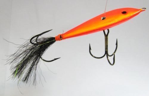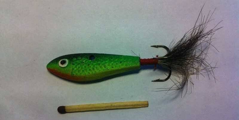 В центре приманки имеется сквозное отверстие, через которое проходит леска и к которому крепится тройник. Для стабилизации положения здесь используется тройник вместо хвостика, замаскированный шерстяной кисточкой. Приманка отличается еще и тем, что в передней части у нее крючка нет.