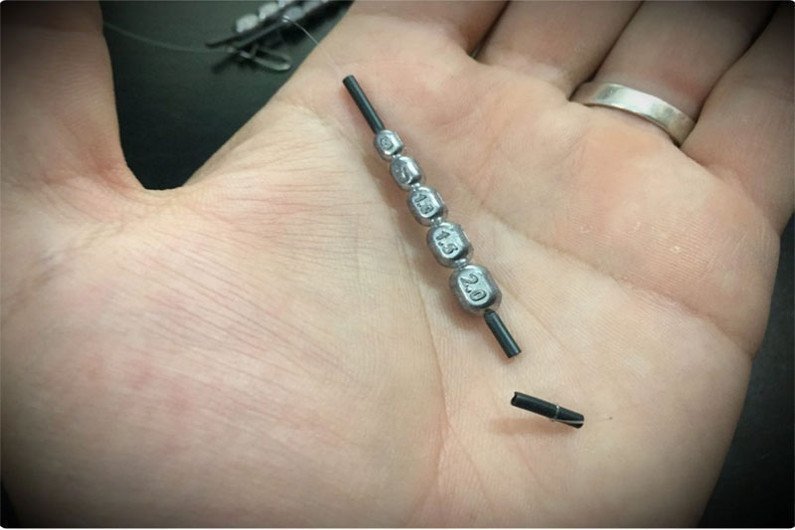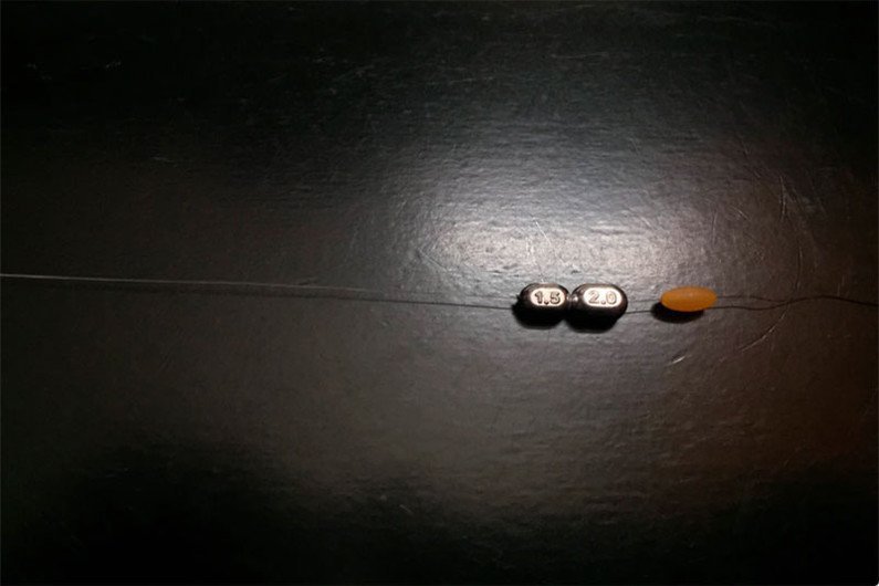 В конечном итоге у меня осталось два грузила на 1.5 и 2 грамма. Продеваем их на основной шнур и фиксируем силиконовым стопором.