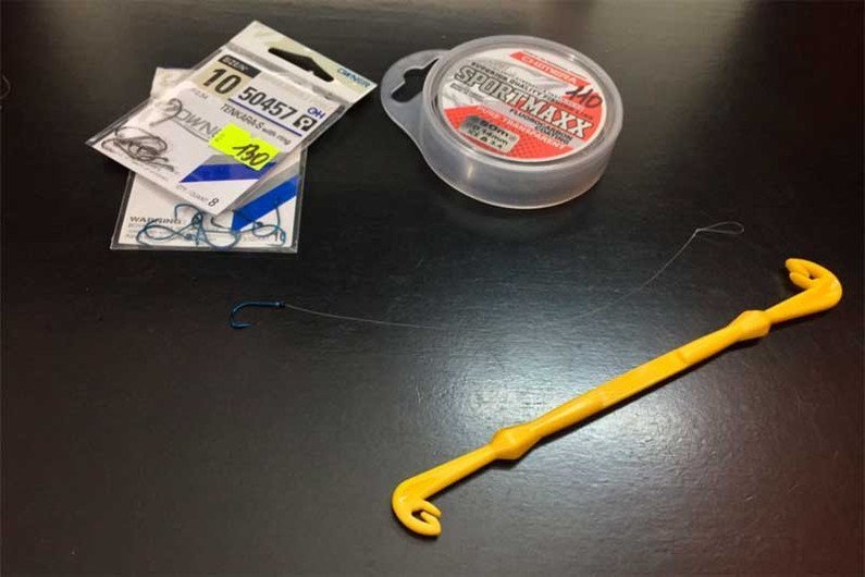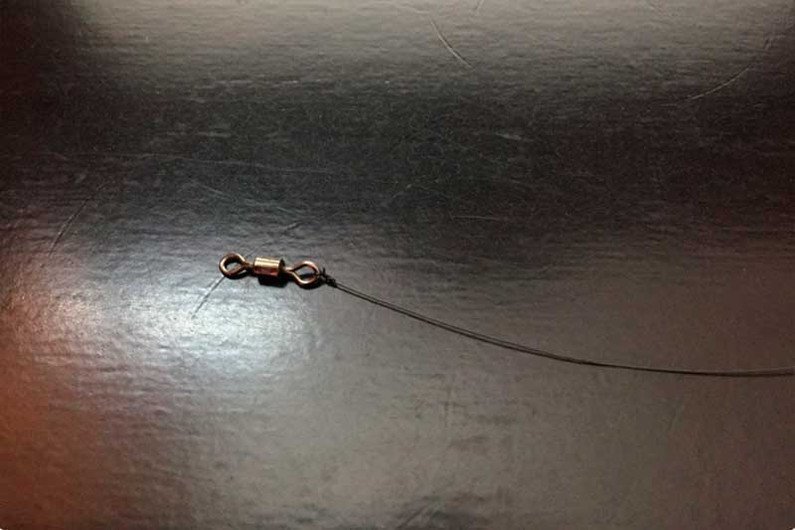 Осталось сделать хороший поводок длиной и зафиксировать его на вертлюге узлом петля в петлю. Оптимальная длина поводка от 15 до 25 см. Диаметр основного шнура у меня 0.22 мм (разрывная нагрузка 7.3 кг), а поводок 0.14 мм (разрывая нагрузка 3.4 кг). Петельку на поводке советую делать при помощи петлевяза.