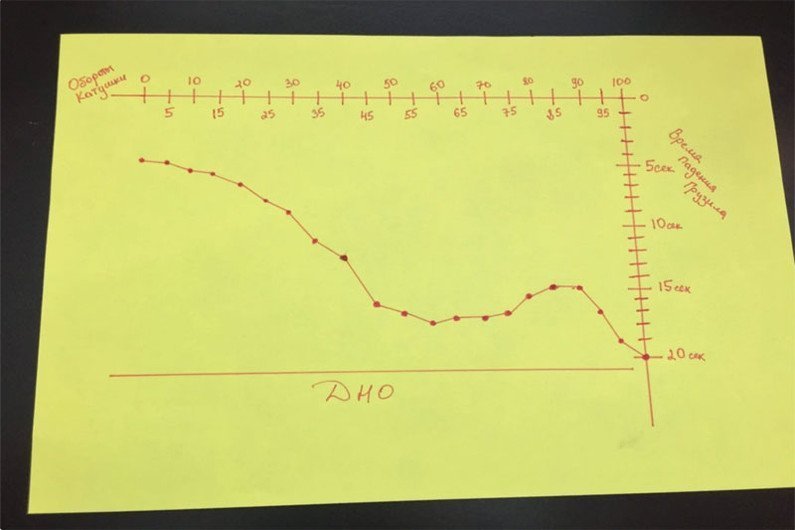 - Как нужно проматывать: делаем заброс на максимальное расстояние (у меня это 100 оборотов), снимаем клипсу, делаем 5 оборотов, опять клипсуемся, выматываемся, делаем заброс, считаем на какое число упал грузик и записываем. Повторяем все процедуры до самого берега. Я сделал промежуток в 5 оборотов. Чем меньше будет этот промежуток, тем точнее будет схема.