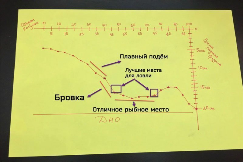 Теперь мы видим, что бровка у нас находится от 45 до 40 оборотов катушки, плавный подъём от 40 до 30 и красивое рыбное место от 45 до 70. По такому графику я понимаю, что лучшие места для ловли будут считаться на 45 обороте или на 70.