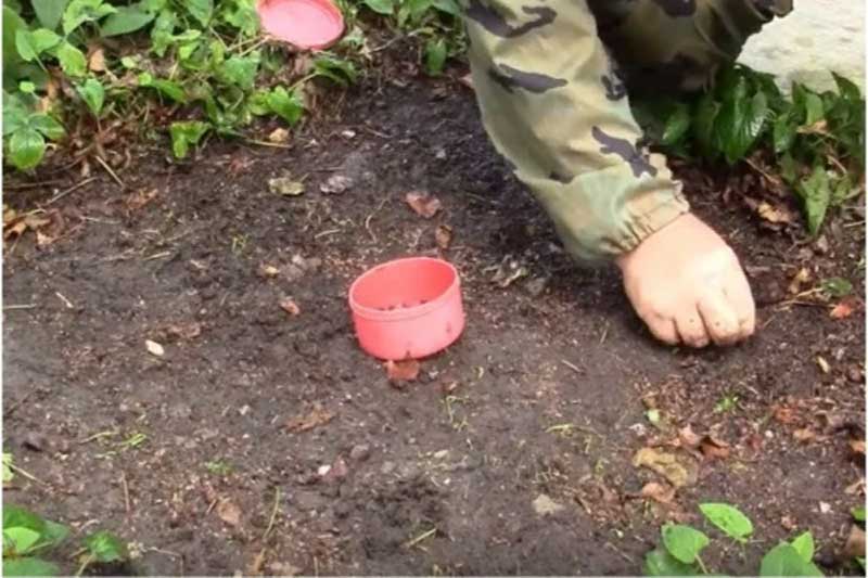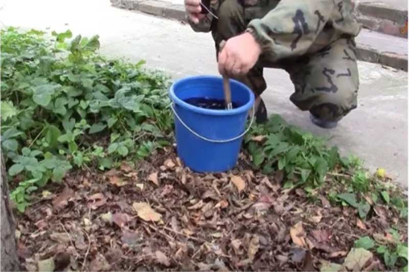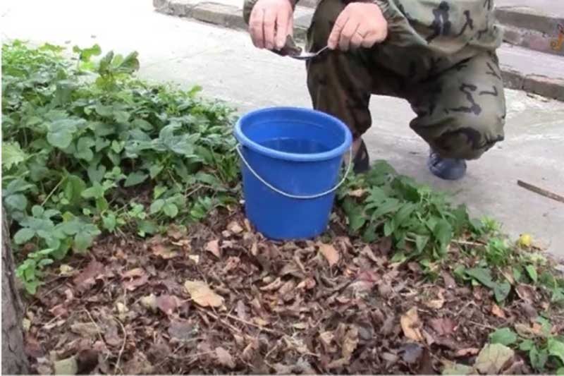 Обильно поливаем подготовленную зону раствором марганцовки. Буквально через несколько минут вы увидите, как из земли начинают активно выползать черви. Главное — не упустить момент и иметь под рукой ёмкость для сбора наживки.