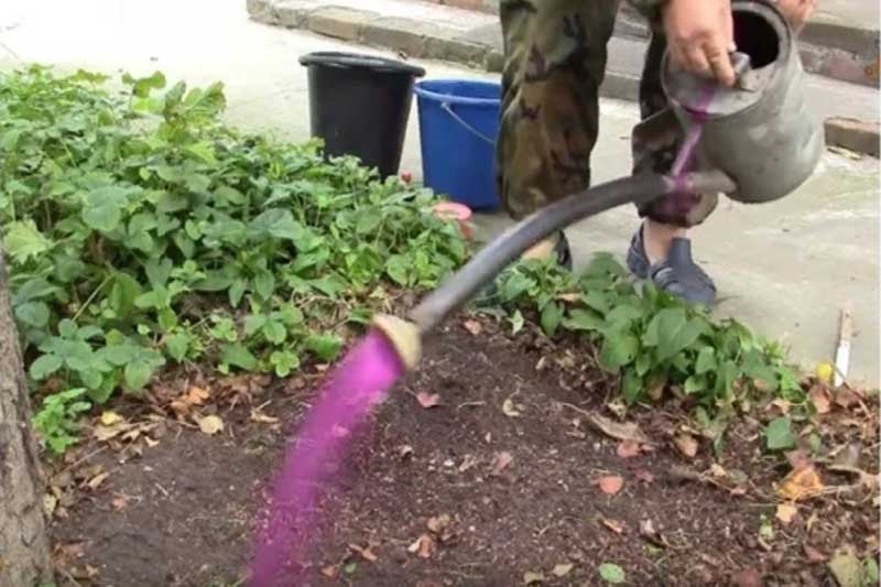 Разводим марганцовку в воде: на 8–10 литров воды берем чайную ложку порошка. Хорошенько перемешиваем — раствор должен получиться насыщенного розового оттенка, но не слишком темным.