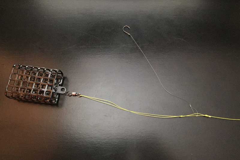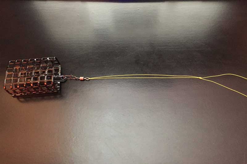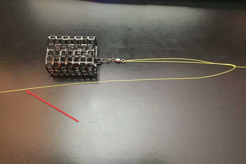 После этого в полученную петлю продеваем сделанный поводок с крючком и фиксируем его узлом удавка. Он всегда будет находиться в пределах этих узлов и никуда не денется. Остаётся зафиксировать вертлюг на основной петле и одеть кормушку. Оптимальная длина поводка 20-30 см.