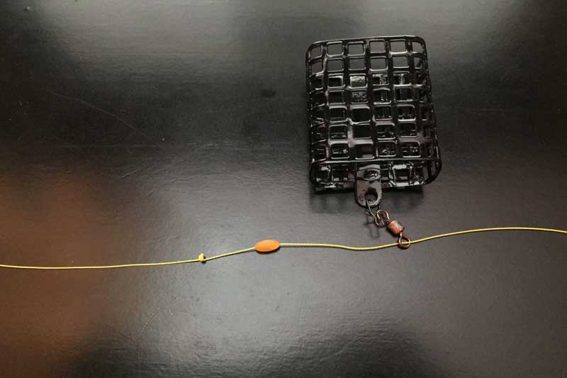Делается монтаж очень просто. Продеваем на основной шнур вертлюжок с карабином, одеваем на него кормушку и фиксируем всё это дело стопорком.