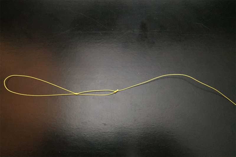 Вяжем 2-4 обычных узла на основном шнуре, что бы стопорок не слетел. Отступаем от этого узла примерно 12 сантиметров и вяжем петельку для поводка.