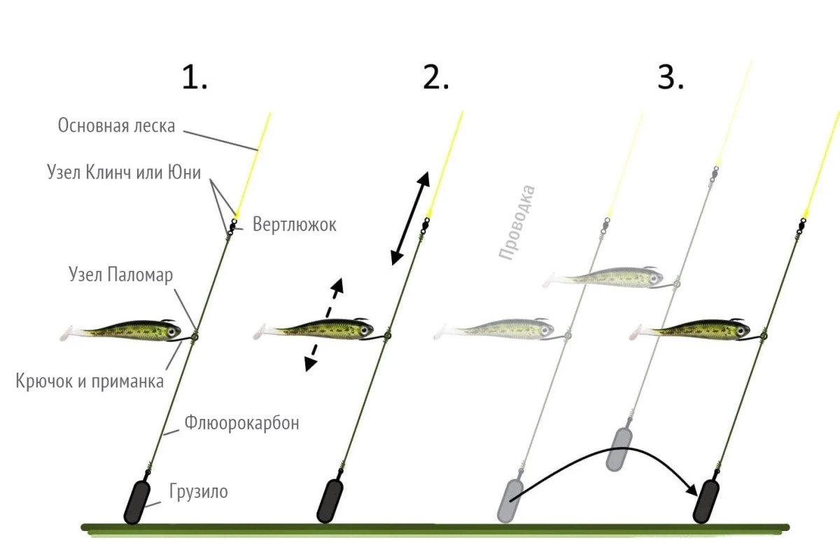 Эта проводка работает не только при ловле на классический или шарнирный джиг / микроджиг, но и с разнесенными оснастками типа дроп-шот, сплит-шот, каролина.