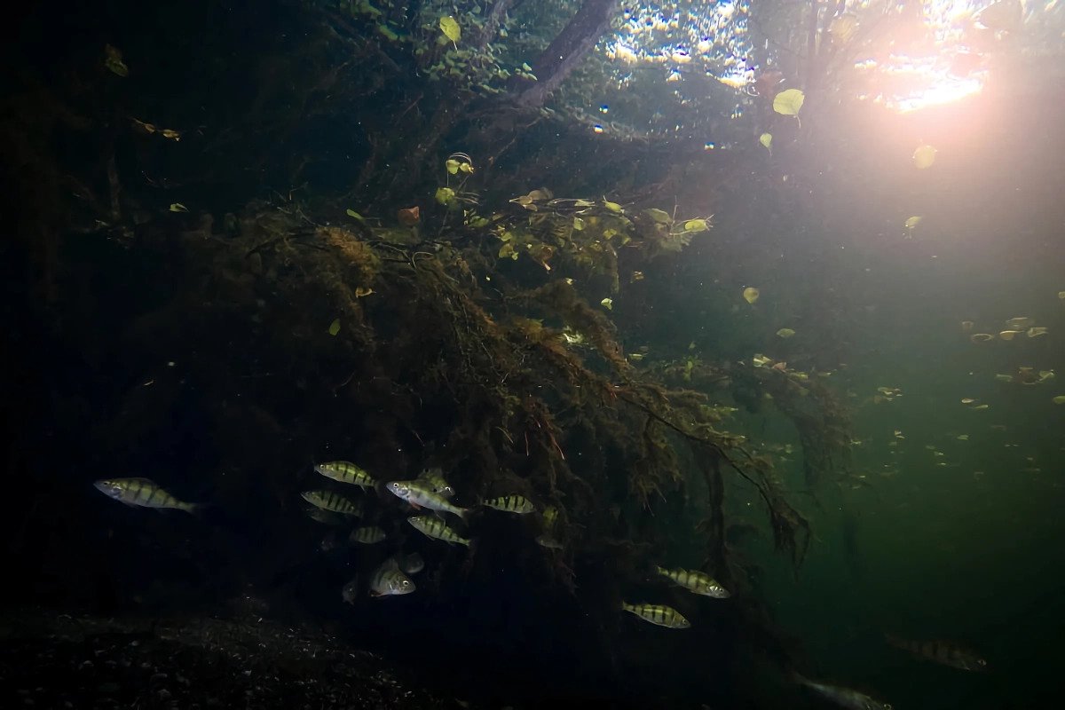 Уважающий себя окунь выбирает тактику охоты под рельеф местности.