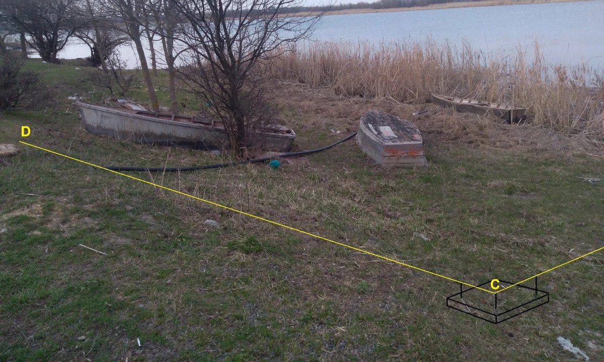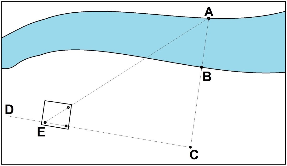 После чего, выбираем две наиболее приметные точки по обоим берегам и совмещаем с ними по линии взгляда две вершинки нашего устройства, как показано на рисунке ниже (Для удобства восприятия, буду использовать для обозначения отрезков сторон латинские буквы: A, B, C, D и т.д.).