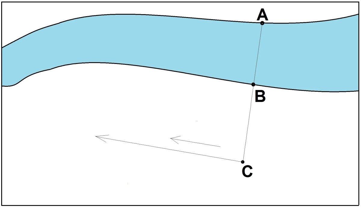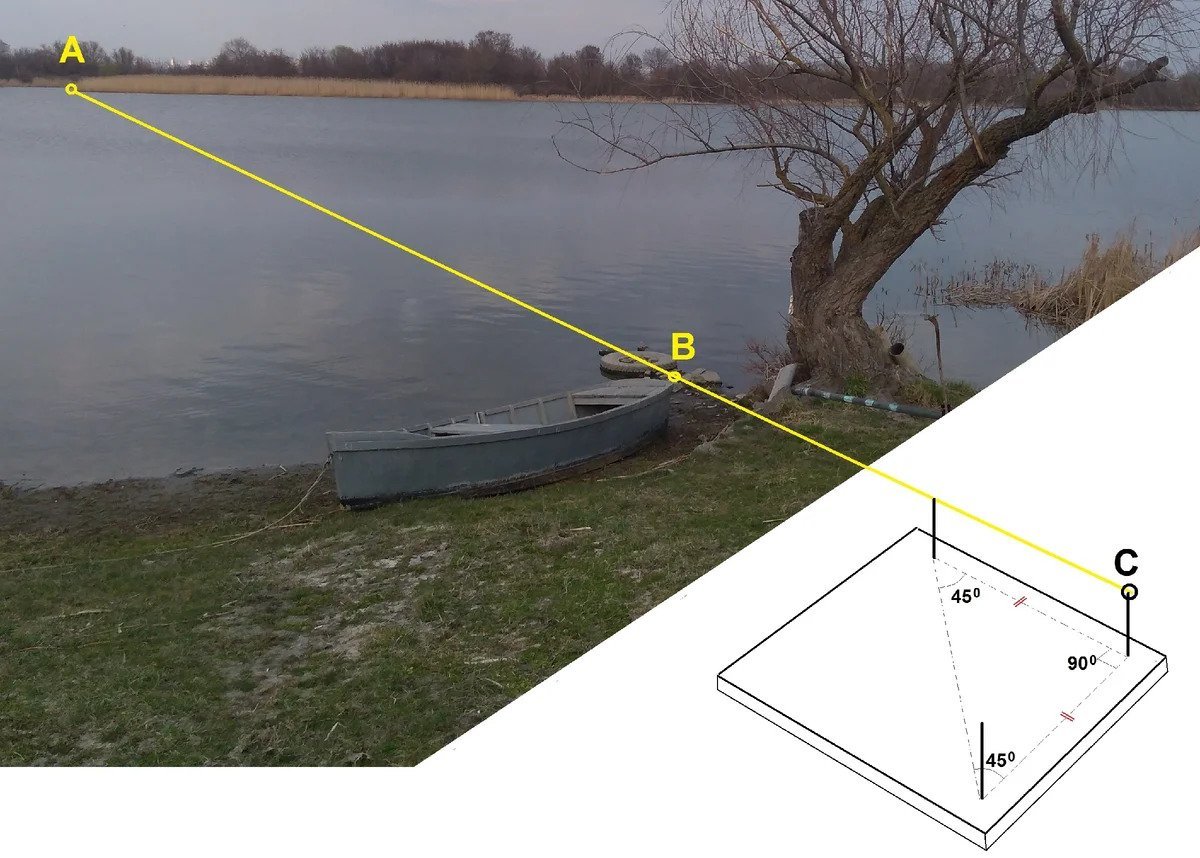 В данном способе все также выбираем наиболее приметные две точки на двух берегах А и В, и устанавливаем колышек в любую точку С, выбранную на прямой, таким образом А, В и С - лежат на одной прямой линии.