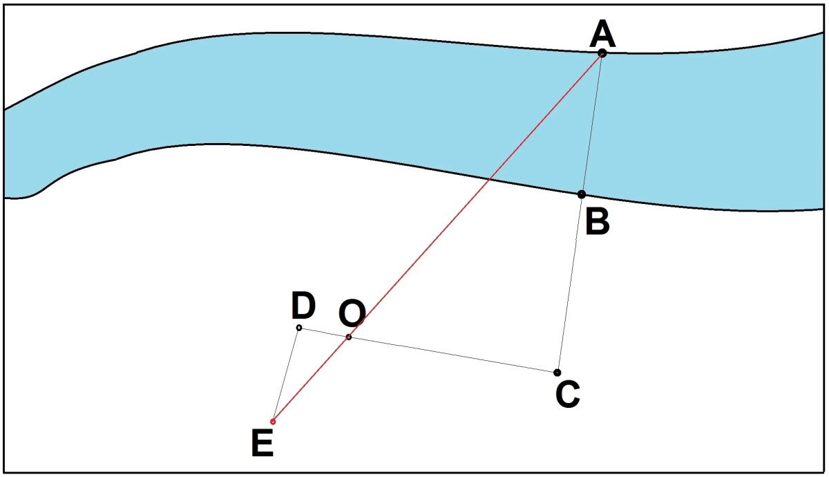 Теперь, достаточно от точки D сделать несколько шагов назад под прямым углом, чтобы совместить на одной прямой линии колышек в точке О и точку на противоположном берегу - точку А (на рисунке - красная линия).