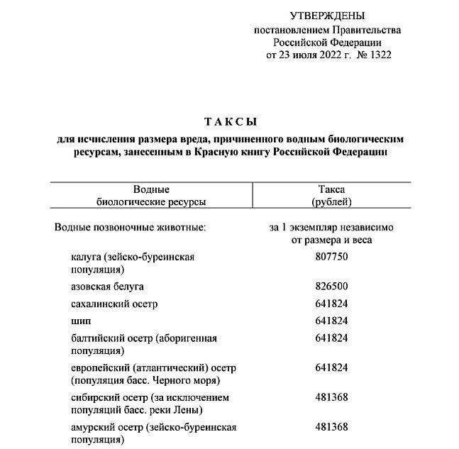 А ранее, действительно фигурировала другая сумма, не зря я засомневался: за одного сибирского осетра вне зависимости от размера, такса равнялась 160456 рублей. Ну и бонусом сверху, если поймать в запретный период или в запретном месте, ещё 100% сверху. Да и за каждый килограмм икры осетровых учитывается ещё 100 процентов таксы...