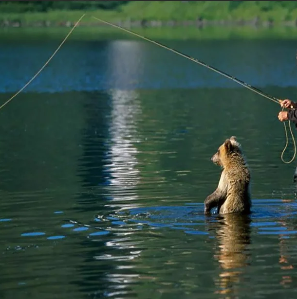Резким взмахом рыбак отправил снасть с приманкой в водяную гладь, и тут же клёв не заставил себя долго ждать. Спустя время в садке у мужчины уже трепыхалось несколько форелей и один массивный хариус. Обрадовавшись удачному улову и войдя в кураж, рыбак вытаскивал одну рыбу за другой и даже не заметил, как сзади него подкрался маленький бурый медвежонок.