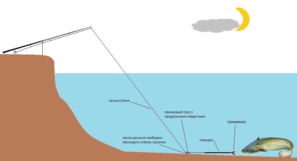 Сом предпочитает глубокие ямы, омуты и затоны, особенно если рядом есть коряги, камни или другие укрытия. Лучше всего ловить на границе этих мест и мелководья, где сом охотится.