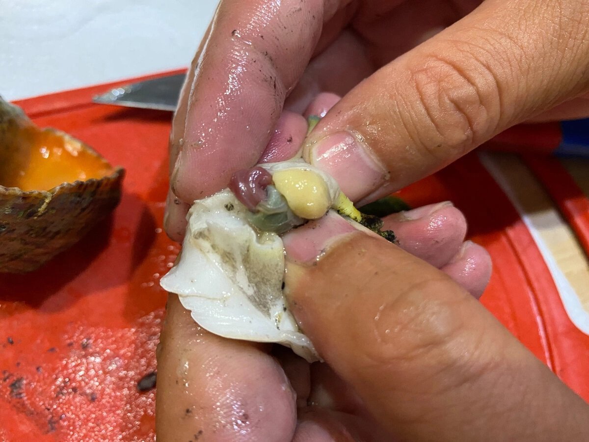 Даже мертвые и ошпаренные рапаны сидят в раковине очень плотно. Советую поддевать их вилкой, но у меня получалось и пальцами. Берем ракушку, достаем из нее рапану.