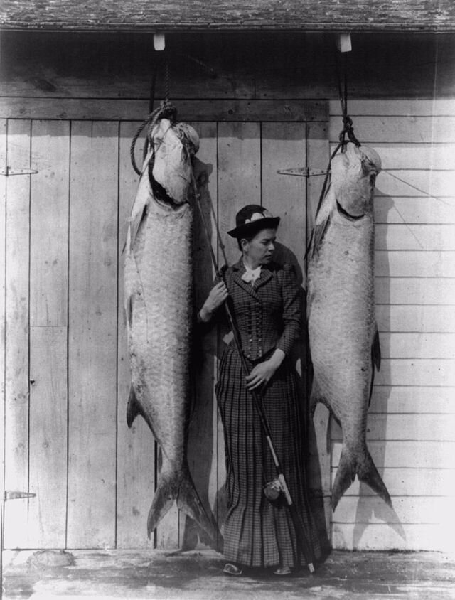Флорида, США, 1921 год. Миссис Шульц Хейтман с пойманным тарпоном. Эти "монстры" могут достигать 2,5 метров и веса в 160 кг, но эта "малышка" потянула только на 84 кг.