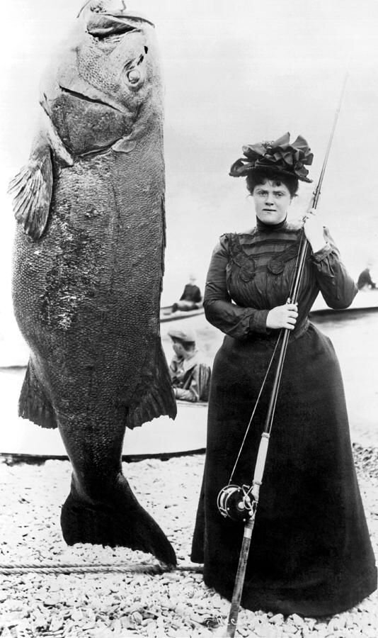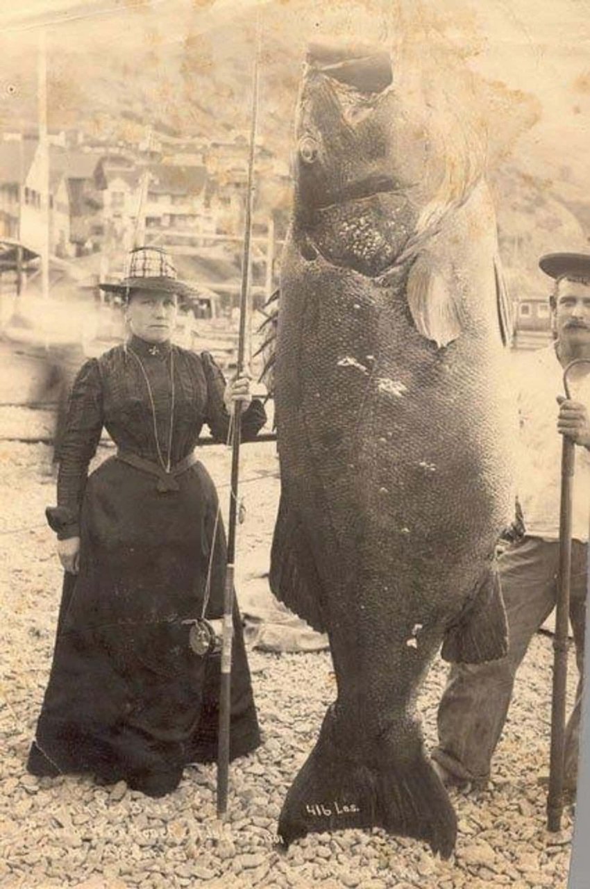 Викторианская рыбачка в элегантной шляпке и гигантский морской окунь. Размер и вес, к сожалению, не сообщается.