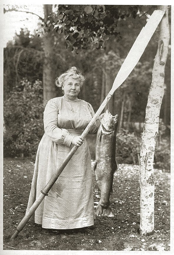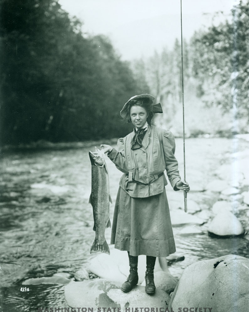 Элеонора Читтенден, дочь бригадного генерала Хирама Читтендена, держит выловленную стальноголовового лосося на реке Эльва. Снято 1 августа 1907 года Асахелем Кертисом.