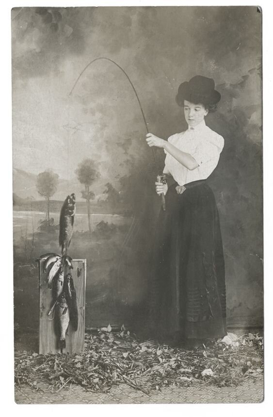 Думаете, что и эта дамочка просто позирует? Нет, вот вам ещё несколько примеров того, что женщины в ту пору вполне себе увлекались рыбалкой.