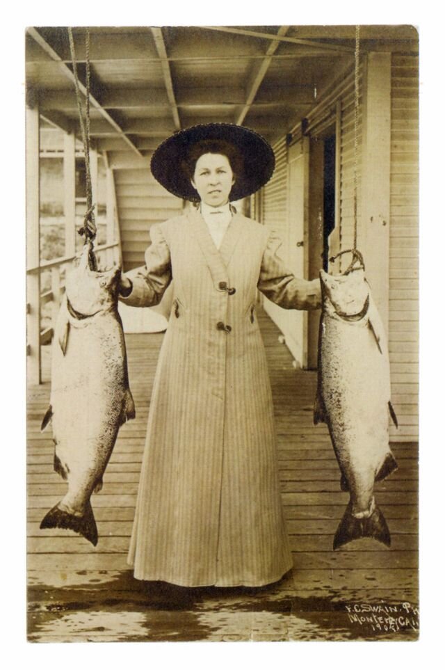 Далее у нас ещё одна почтовая открытка 1909 года. На ней запечатлена женщина в шляпке и пальто и, если не ошибаюсь, два внушительных лосося. Снято где-то на полуострове Монтерей (Калифорния), но точно не в фотостудии.