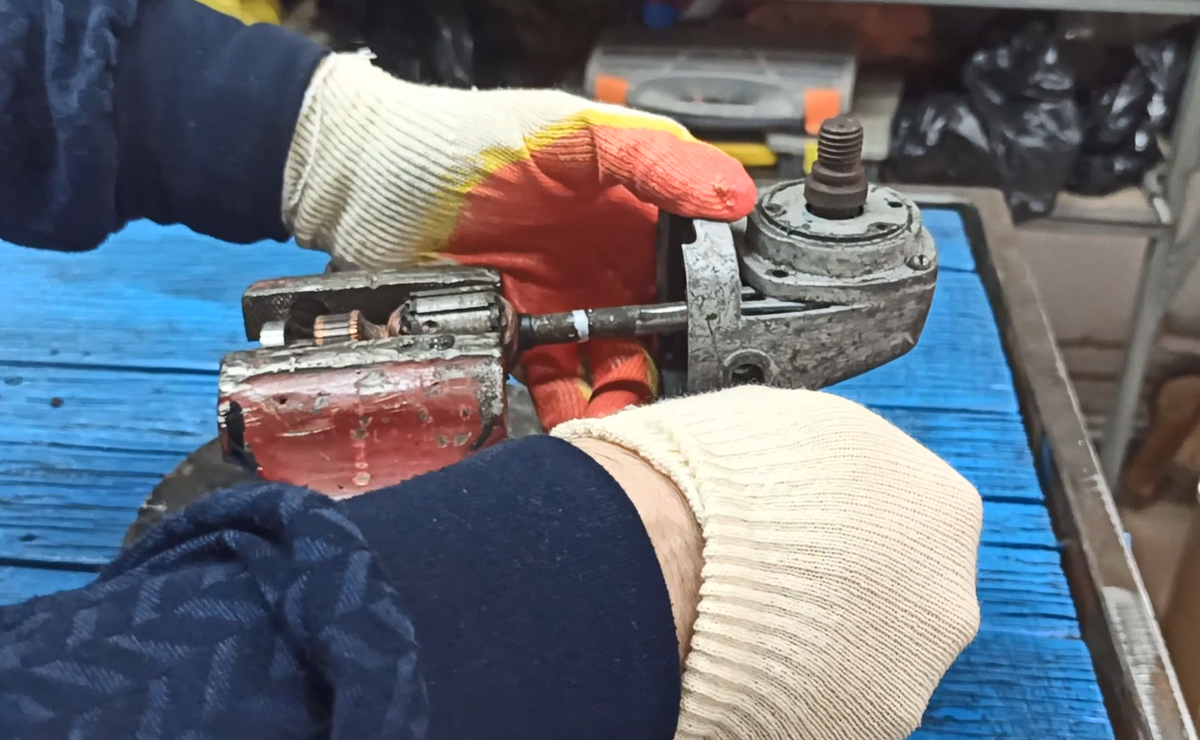 Далее, зажимаем якорь в тисках и отпиливаем лишнее.