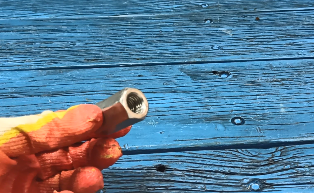 Теперь чтобы соединить его с ледобуром нам с вами понадобится вот такая увеличенная гайки, если не ошибаюсь на 14.