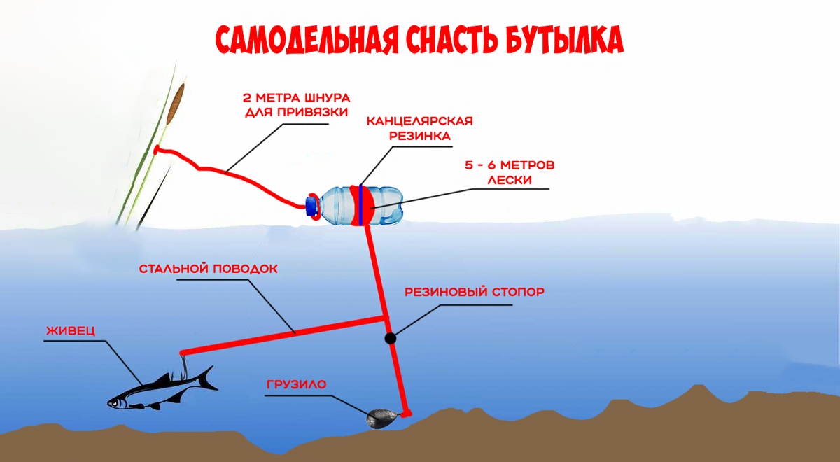 После выбора места нужно поставить снасть. Бутылку привязывают веревкой к палке или к камышам, потом продевают сквозь жабры рыбы-живца поводок и закрепляют крючок. Леску разматывают так, чтобы грузило опустилось на дно.