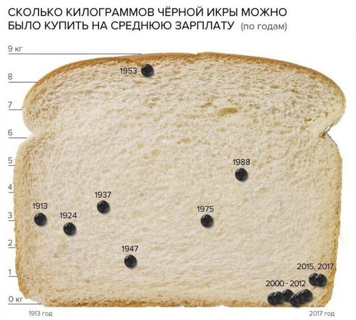 На протяжении десятилетий стоимость продукта менялась. Дешевле всего черная икра была в 1953 году. Цены на нее были ниже, чем в 1910-х годах перед началом Первой Мировой и в 1970-е годы. При этом номинальная цена в 1953 году превышала показатели 1913 года в восемь раз.
