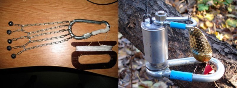 Простейший отцеп – это обычный замок висячей конструкции. Если его вес недостаточный, то придется добавить к нему груза. Замок, закрепленный на шнурке, опускают по леске в точку зацепа, где он ударяет по крючку дужкой и освобождает снасть от зацепа. Поэтому, можно легко сделать отцеп своими руками. Для этого нужно взять раздвижные кольца, на которых хранятся ключи, и добавить к ним груз, весом около 30-ти граммов. Чтобы леска не смогла выскользнуть из кольца, на кольцо лучше нацепить не большой отрезок ниппельной резинки. После этого к кольцу крепят прочный капроновый шнур.