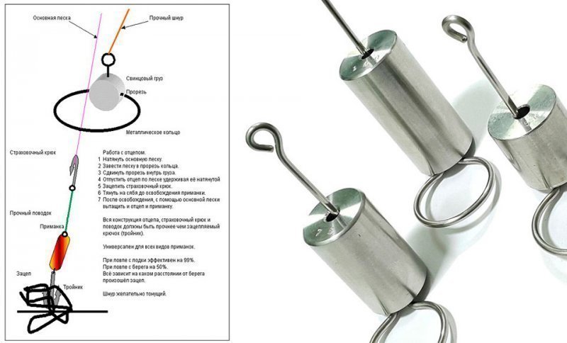 Такая конструкция представляет шаровидное грузило с металлической петлей, которое крепится к веревке. С другой стороны грузила имеется круглая скоба, а сверху над ней расположена прямоугольная рамка, которая фиксируется на скобе с помощью пружины. В рамку через прорезь заводится леска, после чего планка отпускается, чтобы леска находилась в зафиксированном положении. Дальше остается только отпустить грузило, которое по леске начнет движение в сторону зацепа.