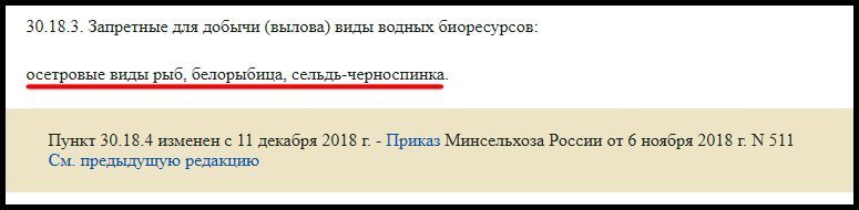 - Правила Рыболовства в пункте 30.18.3 указывают, что в России полностью запрещено ловить сельдь-черноспинку, осетровых и белорыбицу.
