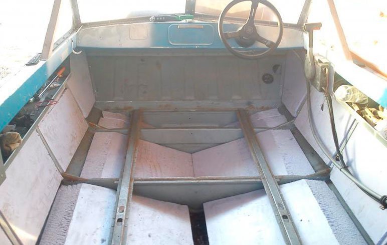 Размеры этой разработки такие же, как и у предыдущей. Но в этой конструкции сделали открытой носовую часть, где может расположиться один из пассажиров. Между левой и правой частями ветрового стекла организован проход. Эта конструкция может вместить до 5 пассажиров.
