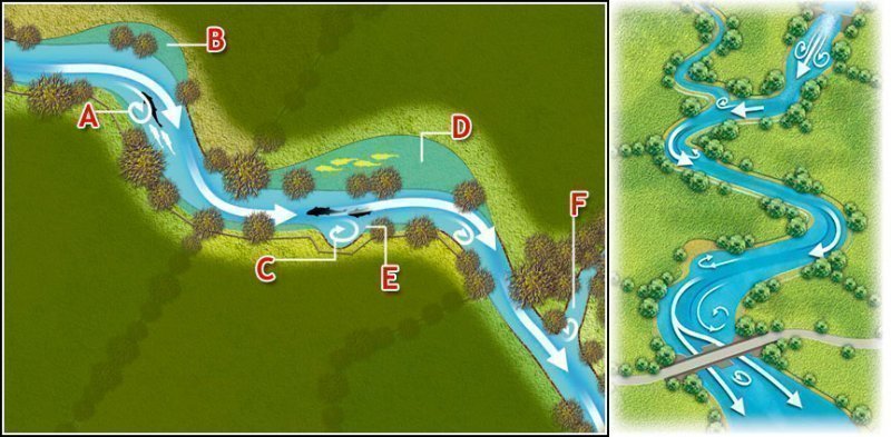 Многие рыбаки перспективные места определяют визуально. Их можно определить по характерным завихрениям на поверхности воды, указывающие на границы перекатов и ям. Если раньше это давало хорошие результаты, то в наше время этого уже мало. Скорее всего, это связано с тем, что рыбы стало меньше и в то же время, она стала умней. Исходя из этого, отправляясь на рыбалку, следует вооружаться основным правилом: в первую очередь нужно изучить рельеф дна и лишь потом, приступать к прикормке и рыбалке.