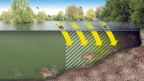 После изучения рельефа дна и определения перспективного места, можно начинать прикармливать рыбу. Для этого нужно сделать отметку на леске, которая будет указывать на точное расположение места прикормки. При этом, можно будет делать все остальные забросы в одно и то же место. Такая техника подходит для водоемов со стоячей водой или при наличии слабого течения.
