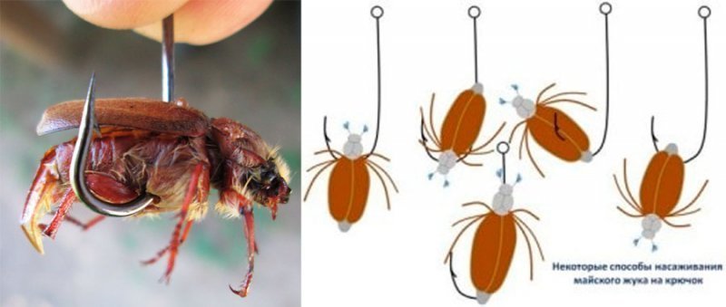 - После этого, в получившийся прокол, вставляется крючок и надежно фиксируется. Такой способ позволяет на одного майского жука поймать нескольких особей.
