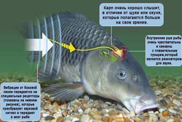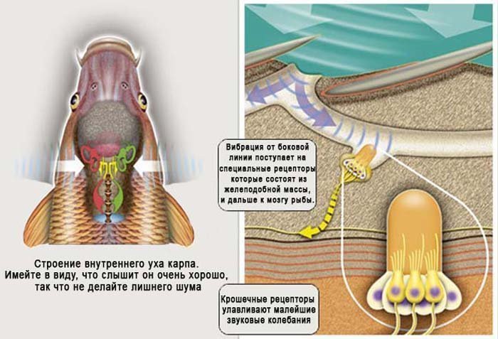 Карповые рыбы, такие как карп и плотва, особенно чувствительны к звукам на берегу. Даже малейшие шаги или удары по земле могут насторожить этих рыб. Хищные виды, например щука, обладают немного иным слуховым аппаратом, в котором отсутствует связь между внутренним ухом и плавательным пузырем. Эти рыбы больше полагаются на зрение, так как их слух ограничен звуками ниже 500 Гц.